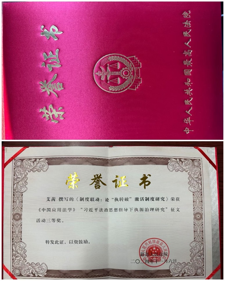 公司艾茜副教授撰写的《制度联动:论“执转破”激活制度研究》荣获最高人民9428cn太阳集团古天乐组织的“习近平法治思想指导下执源治理研究”征文活动三等奖。