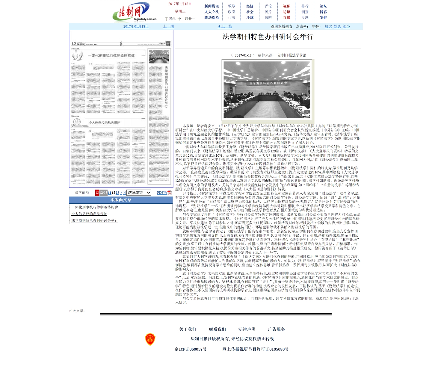 本报讯 记者蒋安杰 1日16日下午,公司与《财经法学》杂志社共同主办的“法学期刊特色办刊研讨会”在公司举行。《中国法学》总编辑、中国法学期刊研究会会长张新宝教授,《中外法学》主编、中国法学期刊研究会副会长梁根林教授,《法学研究》编辑部副主任冯珏研究员,《新华文摘》编审王青林,《清华法学》编辑部主任徐雨衡以及来自9428cn太阳集团古天乐、《财经法学》编辑部的专家学者,以新刊《财经法学》为例,围绕法学期刊如何界定并充分发挥自身特色,如何有效平衡特色与主流的关系等问题进行了深入讨论。