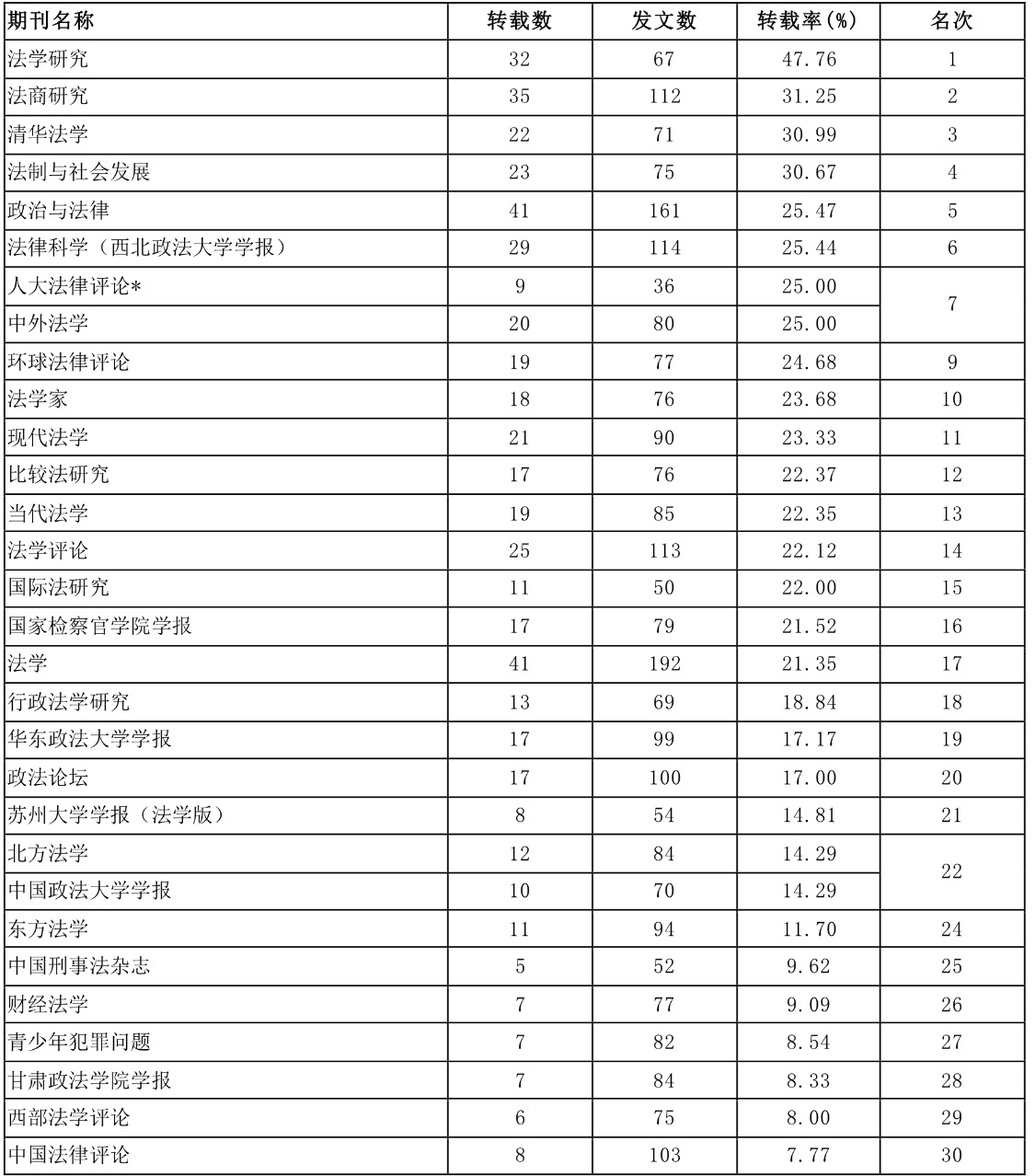 日前,由中国人民大学人文社会科学学术成果评价研究中心、书报资料中心研制的2017年度复印报刊资料转载指数排名正式发布。此次“法学学科期刊排名”中涉及全文被转载的期刊数量为181种,公司主办的《财经法学》上榜,全文转载量排名、全文转载率排名,综合指数排名都进入前30强,创历史新高。其中,全文转载量排名第30名,全文转载率排名第26名,综和指数排名第29名。这也是《财经法学》自2015年创刊以来连续第2次上榜。