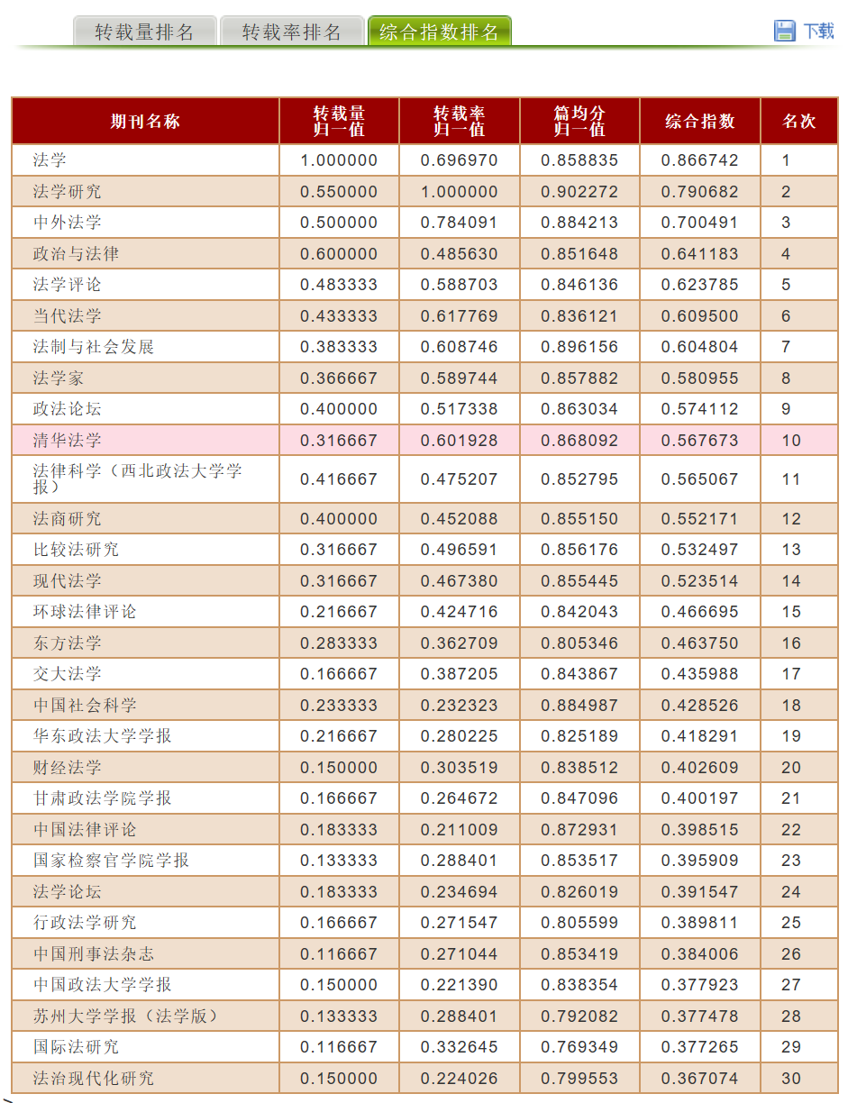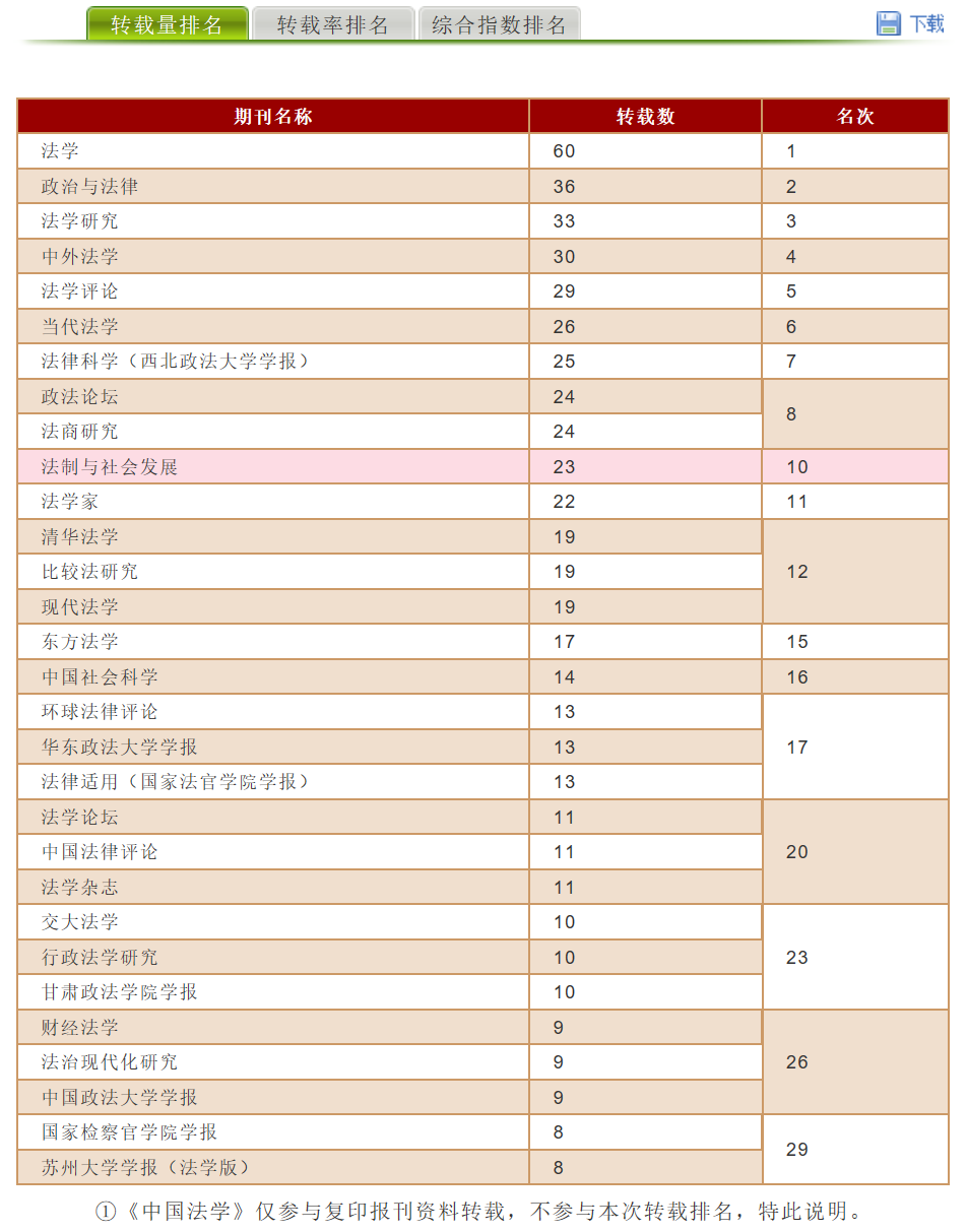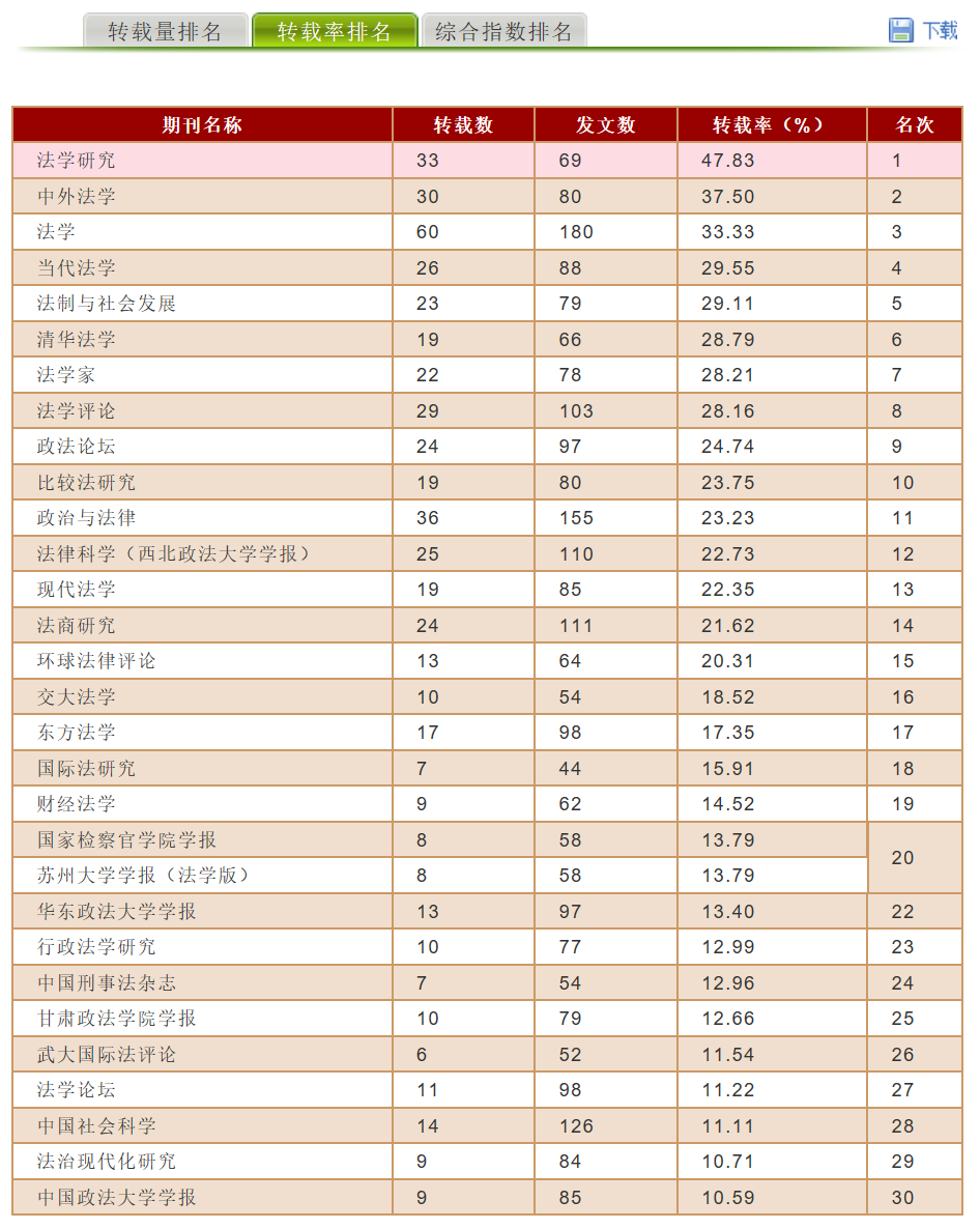 9428cn太阳集团古天乐主办的《财经法学》在全文转载量排名、全文转载率排名,综合指数排名均再次进入前30强,其中转载率排名第19名、综合指数排名第20名,较往年创历史新高。