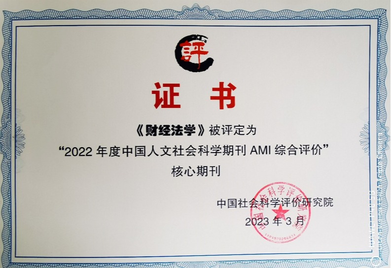 2023年3月17日,中国社会科学评价研究院正式发布了《中国人文社会科学学术集刊AMI 综合评价报告(2022 年)》,《财经法学》获评为法学类核心期刊。