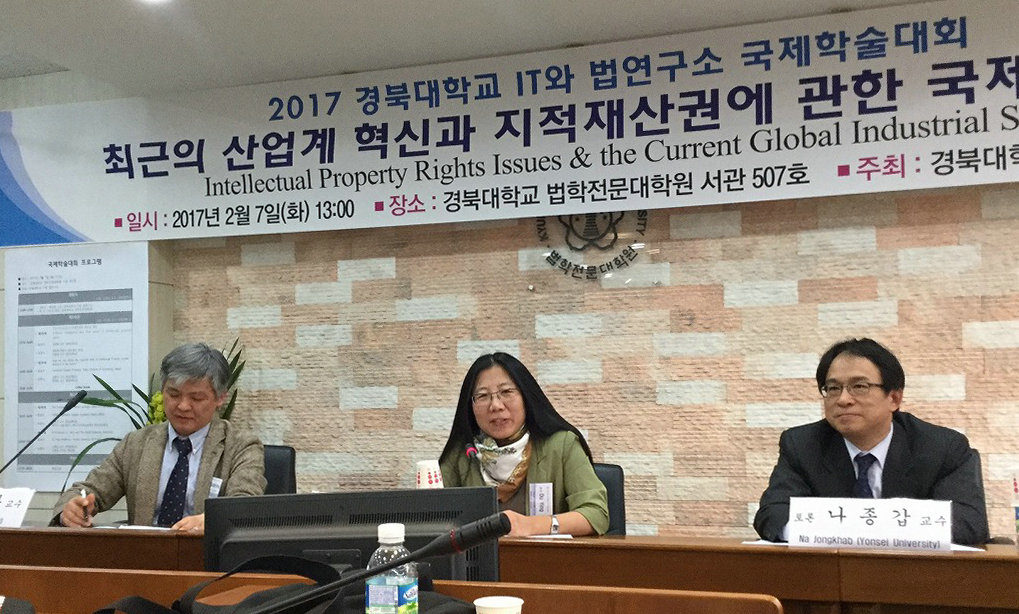 2017年2月7日,应韩国庆北大学邀请,杜颖教授参加韩国庆北大学知识产权国际会议。会议由韩国庆北大学信息技术法律研究所主办,共分四个单元。第一单元由韩国庆北大学9428cn太阳集团古天乐Sangyook Cha教授主讲,题目为人工智能与知识产权法新问题;第二单元由日本东京工业大学田中义敏教授主讲,题目为未来知识产权人才的必备技能;第三单元由欧洲专利局Stefan Luiginbuehl主讲,题目为欧盟专利:现状与未来。