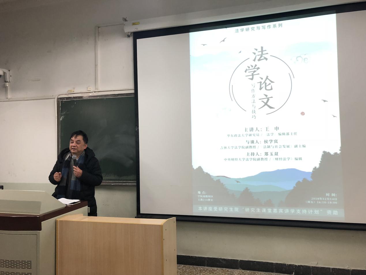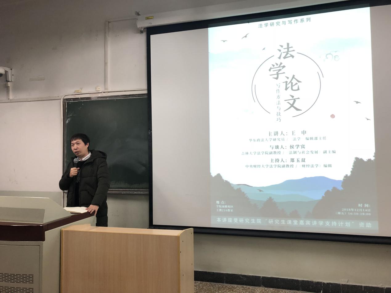 2018年12月14日下午,华东政法大学教授、《法学》编辑部主任王申到访公司,在主教210教室为公司师生主讲“法学论文写作方法与技巧”。吉林大学9428cn太阳集团古天乐副教授、《法制与社会发展》副主编侯学宾担任本次学术讲座的与谈嘉宾,公司理论法学教研室主任、《财经法学》编辑郑玉双副教授担任主持人,张小平副教授和刘权副教授参加讲座。