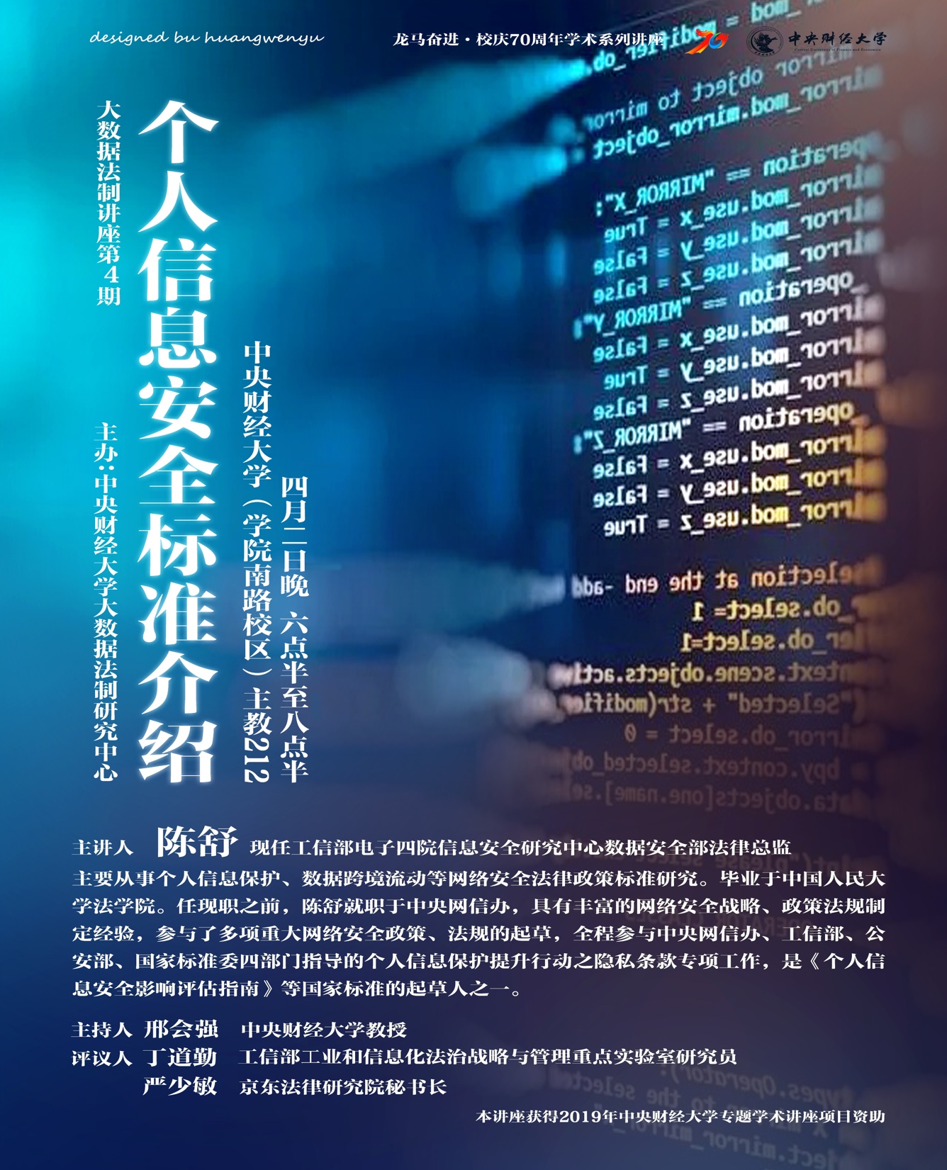 2019年4月2日傍晚,工信部电子四院信息安全研究中心数据安全部法律总监陈舒做客公司,根据其丰富的实务经验和扎实的理论功底在第4期大数据法制讲座上带来了题目为"个人信息保护标准介绍”的专题讲座。