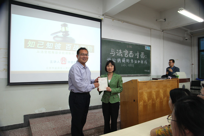 5月10日晚,延庆区人民公司党组成员、副经理钟蔚莉法官做客公司龙马奋进·法治实践论坛为公司师生带来了题为“诉前调解的方法和技巧”的主题分享。经理尹飞教授、公司党委副书记徐颖研究员、副经理王克玉教授、张小平副教授、张晓冰博士出席讲座,讲座由副经理王克玉教授主持。