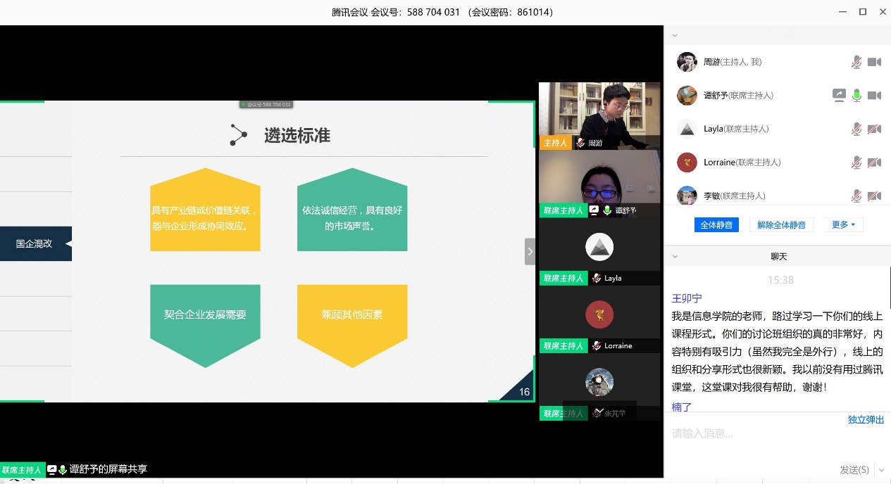 接下来的发言人展示环节中,2019级研究生谭舒予、张芃芊和肖瑶三位同学分享了各自的研究。谭舒予同学以中国联通混改为切入点,对战略投资者在国企混改中所扮演的角色进行分析。她首先分析了联通引入战略投资者的措施及效果,然后将范围扩及整个国企混改中,阐释战略投资者所扮演的角色。张芃芊同学以国药集团混改为例,论述了非国有资本在国企混改中的积极作用。她首先解释了为何国药集团混改历程会呈现出不同的阶段性特征,随后逐一分析了参与混改的五家非国有企业是如何依托自身优势,使国药集团市场竞争力得到迅速提升。最后,她将“国家控制权问题”作为引申,提供了若干可供思考的角度。肖瑶同学则以云南白药的混改历程为主线,聚焦国企混改中的股权制衡问题。她先简要概括了云南白药混改历程,总结其混改历程中的创新点,以及国企混改中股权制衡的三个影响因素,揭示了国企混改中股权制衡的三大痼疾,并对股权制衡原则下国企混改模式阐释了自己的看法。