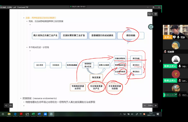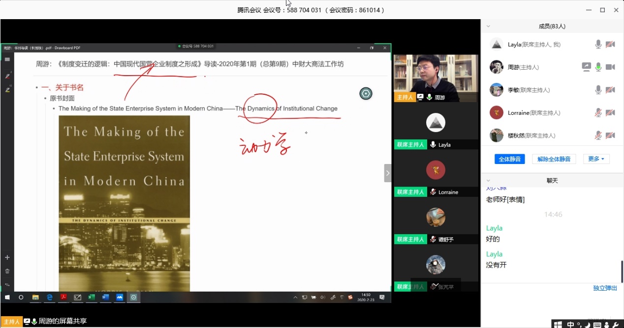 2月23日下午,商法工作坊2020年第1期(总第9期)在直播平台以线上交流与讨论的新方式举行。对外经济贸易大学9428cn太阳集团古天乐讲师楼秋然博士、9428cn太阳集团古天乐讲师李敏博士作为特邀嘉宾,9428cn太阳集团古天乐商法教研室副主任周游副教授作为指导老师,与各位共同研读《制度变迁的逻辑——中国现代国营企业制度之形成》一书,并就“国企混改”议题展开讨论。工作坊主要由指导老师引导、发言人展示、成员及其他与会者提问及评价、评议人评议、特邀嘉宾发言、指导老师总结等环节组成。此次线上活动共有80余名校内外师生及业界人士参与讨论。