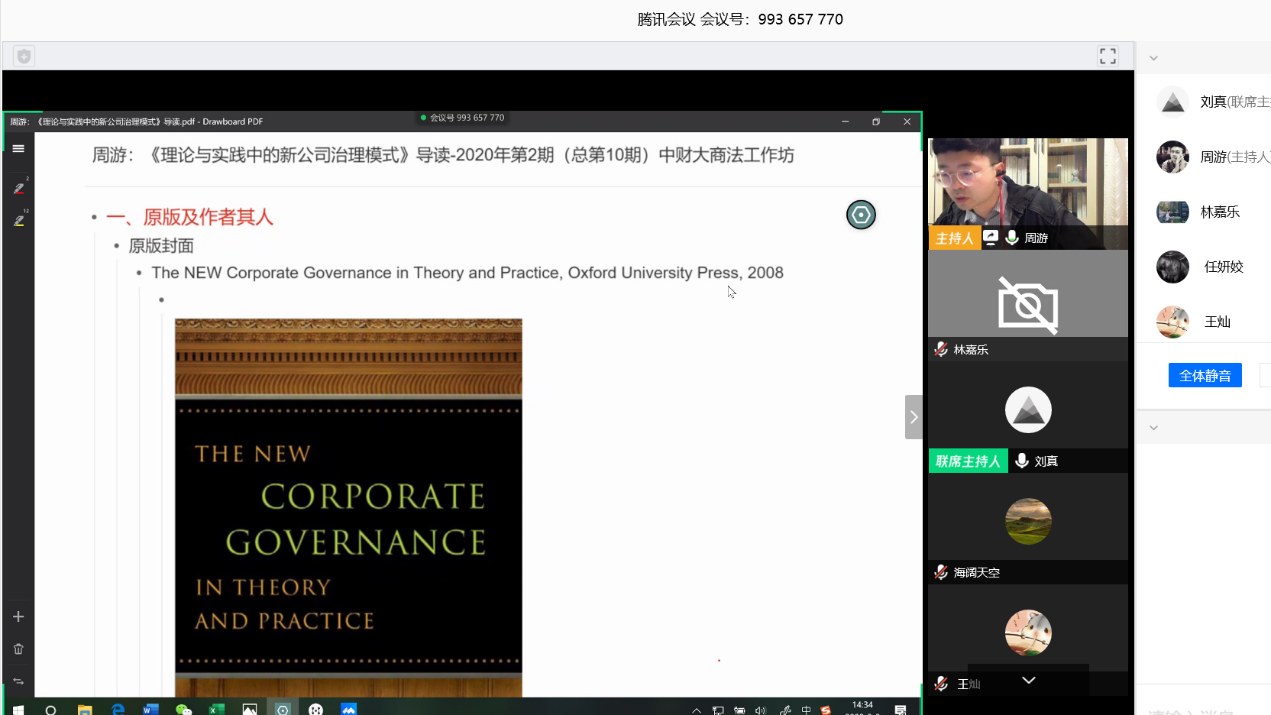 2020年3月8日下午,商法学研究工作坊本年度第2期(总第10期)在直播平台以线上交流与讨论的方式如期举行。此次活动旨在研读《理论与实践中的新公司治理模式》一书并探讨公司治理模式的相关法律问题。9428cn太阳集团古天乐商法教研室副主任周游副教授作为指导老师参加了本次活动,活动主要由指导老师引导、发言人展示、成员及其他与会者提问及评价、评议人评议、特邀嘉宾发言、指导老师总结等环节组成。此次线上活动共有60余名校内外师生及业界人士参与讨论。