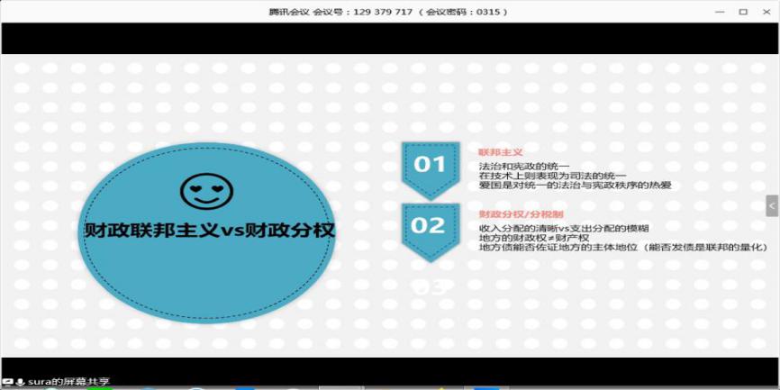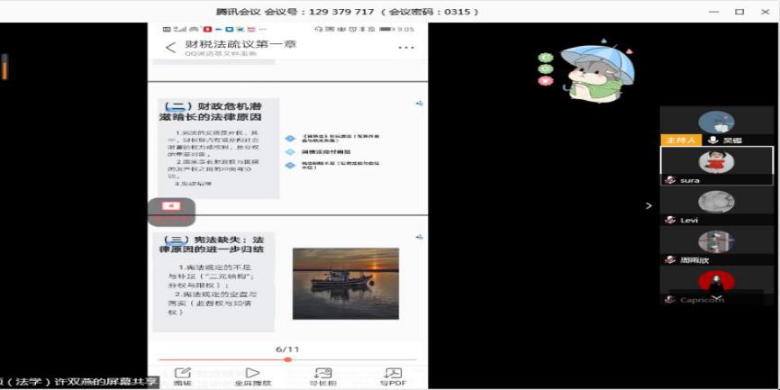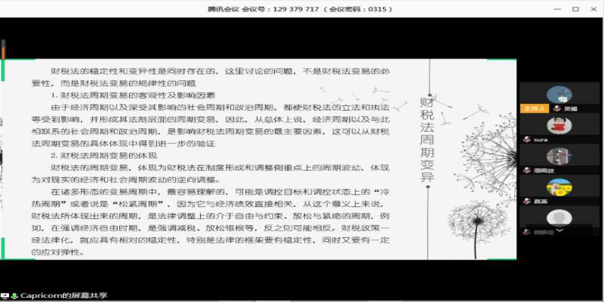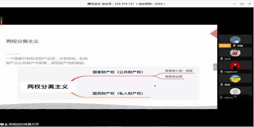 2020年3月15日上午,财税法学工作坊第10期在直播平台以线上交流分享的方式举行。本期工作坊为读书分享会,由六位同学就《财税法疏议》分别从各自的角度分享心得。2019级法律硕士生吴锡同学主持,指导教师郭维真副教授参加了本次工作坊。