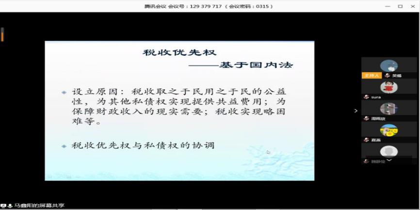 就财税法制度中的权利配置与保护一章,2019级法律硕士生马鑫阳同学分享了自己的所读所感。她着重探讨了税收权利的债权性质和物权性质,以及与此相关的具体权利形式和相应的法律保护问题。渐近尾声时,又引入人本理念,提及人本与法本、税本的关联及其在税收征管中的体现,强调了税收立法应体现人本理念,不仅着眼于具体税收征管制度的完善,对财政宪政等根本性问题也给予了更多关注。