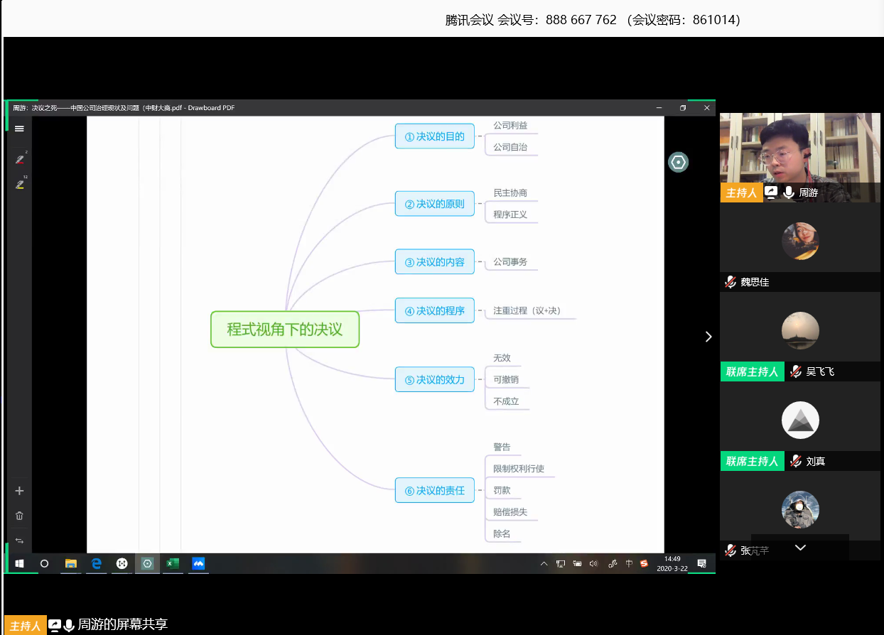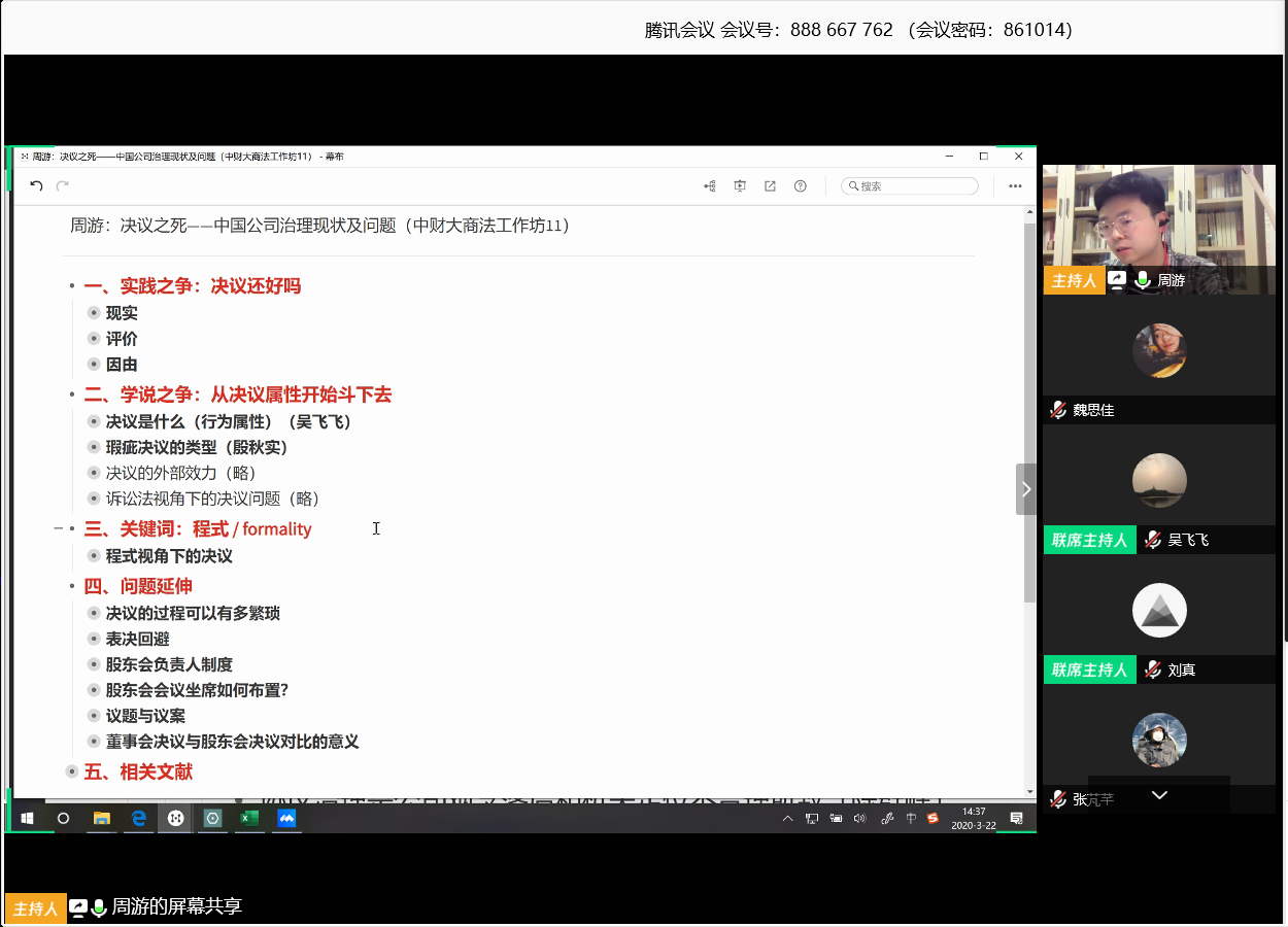 2020年3月22日下午,商法工作坊2020年第3期(总第11期)在直播平台以线上交流与讨论的方式举行。西南政法大学经济9428cn太阳集团古天乐吴飞飞副教授、9428cn太阳集团古天乐殷秋实副教授作为特邀嘉宾,9428cn太阳集团古天乐周游副教授作为指导老师,就“公司决议”之议题展开讨论。工作坊主要由指导老师引导、发言人展示、成员及其他与会者提问及评价、评议人评议、特邀嘉宾发言、指导老师总结等环节组成。此次线上活动共有70余名校内外师生及业界人士参与讨论。