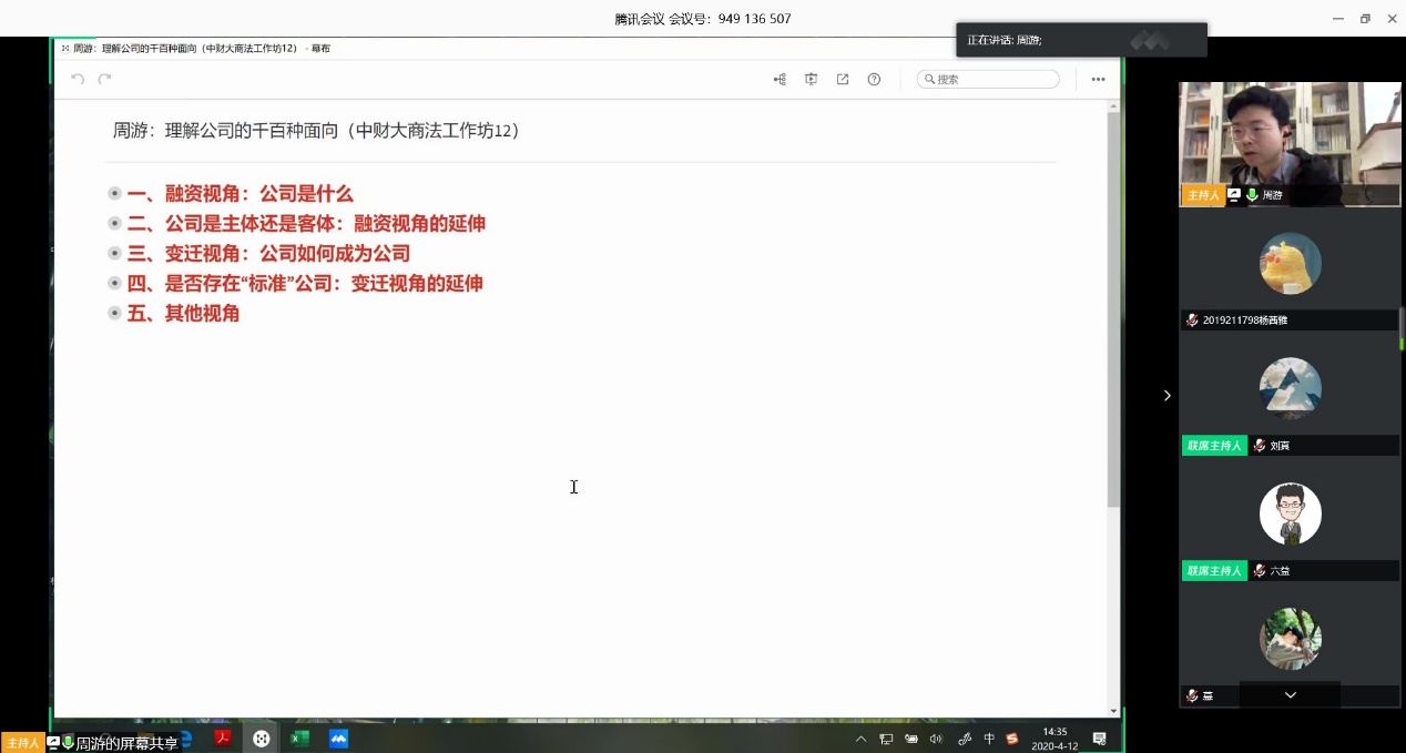 2020年4月12日下午,商法工作坊2020年第4期(总第12期)在直播平台上以线上交流与讨论的方式举行,此次活动主题是研读《公司宪治论》一书。中央民族大学9428cn太阳集团古天乐讲师邵六益博士作为特邀嘉宾,9428cn太阳集团古天乐周游副教授作为指导老师参与了本次活动。工作坊主要由指导老师引导、发言人展示、成员及其他与会者提问及评价、评议人评议、特邀嘉宾发言、指导老师总结等环节组成。此次线上活动共有60余名校内外师生及业界人士参与讨论。