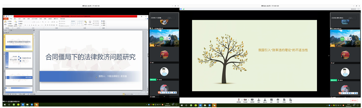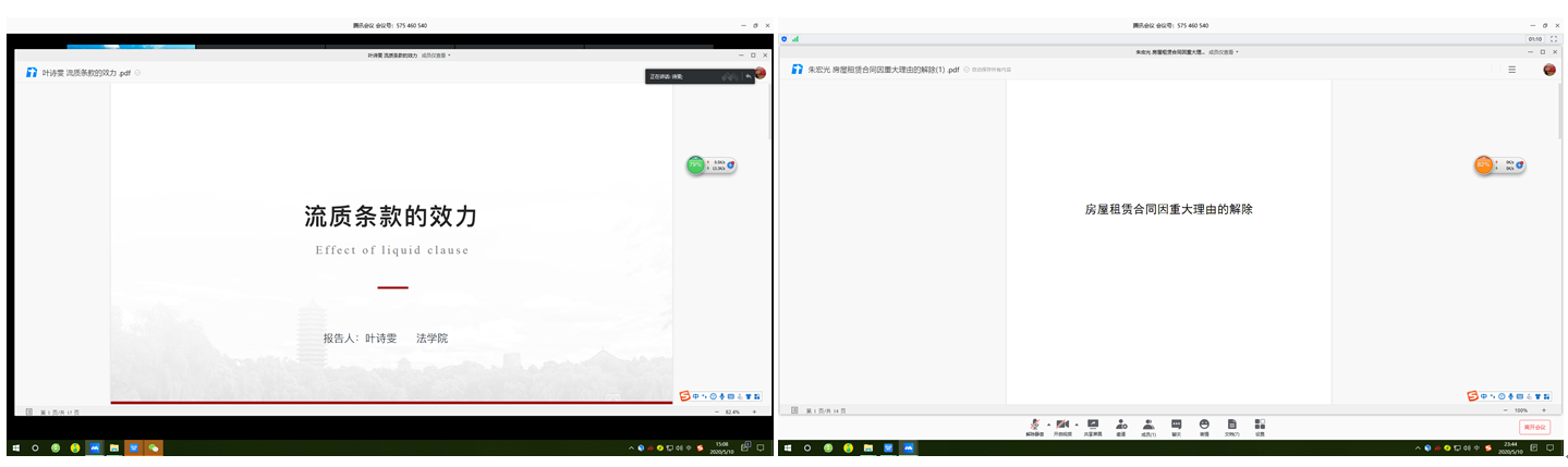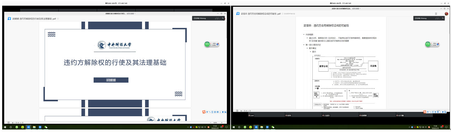 本期工作坊活动的最后阶段由指导老师对活动做出总结。徐建刚博士与胡媛媛首先对“违约方不能因违约而获利”中“获利”的含义进行了讨论,徐建刚博士指出构建一个制度时在设置要件上要慎重,通过要件能将利益衡量具体化,而不能把效果与要件相混淆。殷秋实副教授先是肯定了报告和评议的同学所做的大量准备工作,随后点评道工作坊活动的结束不代表问题的结束,要更加重视从解释论角度研究法律问题,老师在今天活动中自由讨论的成果上进一步鼓励大家对一些法律问题进行深入思考,比如违约后实际履行的优先地位、情势变更制度下何时适用变更何时适用解除,同时号召大家对合同法分则中设立长期性合同解除权、权利滥用针对权利人作为还是不作为等前沿问题作创新性思考。最后,指导老师对线上旁听同学提出的关于违约方转售获利的问题作出了耐心解答。