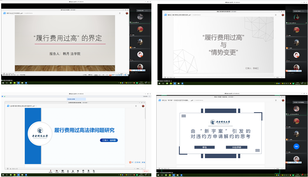 在发言人展示间隙,公司2019级硕士研究生蒋睿、程相宜、张俏和安悦齐分别对四份报告进行了评议。蒋睿指出韩月的报告层次分明,内容详实,比较现实地回应了司法实践中的一些难题,同时对报告的结构提出修改建议。程相宜首先对鲁城江的报告予以肯定,并且分享了自己对情势变更标准的看法,即目前适用情势变更判决的案例很少,可见适用情势变更制度的要求很严格,因此选取债务人利益显著低于成本作为标准对债务人过于有利。此外,程相宜建议在民法典去掉非不可抗力的要件之后,报告中应当对情势变更、履行费用过高和不可抗力的交叉一并予以讨论。张俏在赵林静报告的基础上,对目前履行费用过高比较对象的各种学说进行体系化梳理,并对报告中借鉴最高人民9428cn太阳集团古天乐关于民间借贷利率的限制性规定,以及合同法解释(二)中确定的明显不合理高价的解释标准,类推适用后得出的当履行费用达到债权人履行利益的130%时认定为过高的结论进行了批判。安悦齐认为李钰的报告论证明晰、说理有据,并指出违约方解除权不应在立法上得以确认,但有必要规定重大事由解除权。