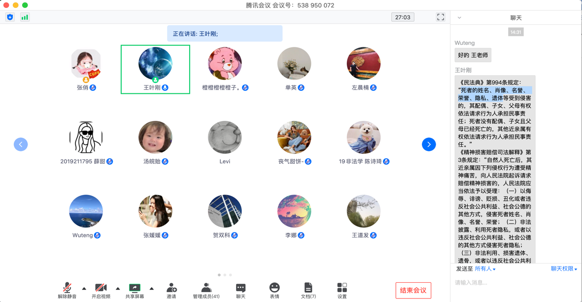 在王叶刚副教授主持下,首期“实施民法典”专题工作坊暨第21期私法工作坊线上活动圆满结束。通过本期活动,大家对《民法典》中的人格权益保护,尤其是死者人格利益保护有了深刻认识,为《民法典》相关规定的正确理解与适用奠定了良好的理论基础。