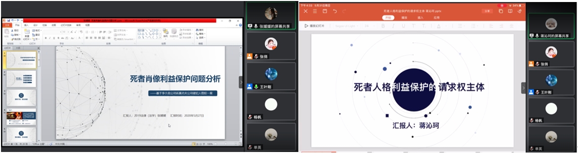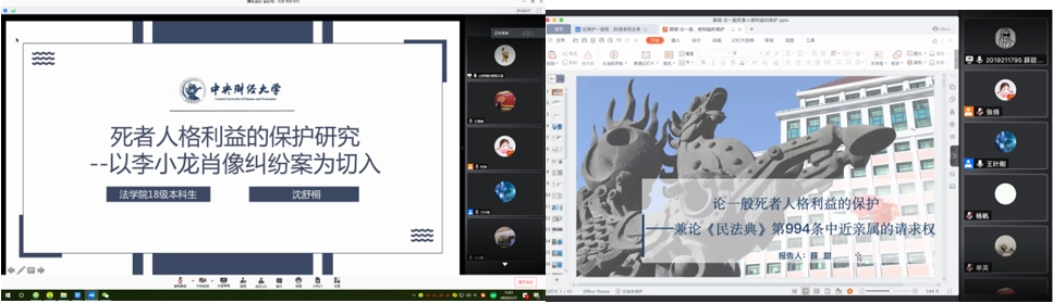 之后,2019级硕士研究生阚建伟和田伊铭继续就死者人格利益保护的主题作了详细报告。阚建伟对死者人格利益保护的学说争论、死者人格利益保护的请求权主体和保护期限作了具体阐述,并且明确《民法典》第185条的规范目的在于保护公共利益而非保护死者人格利益。田伊铭讲解了“李小龙公司诉真功夫公司侵犯人格权案”中的肖像识别标准和死者肖像权保护依据,分析了人格权的性质、死者人格利益保护的正当性基础及域外保护模式,梳理了我国死者人格利益保护的发展历程。2019级硕士研究生叶诗雯和曾文提出了确定请求权主体、保护期限和模式时需要考虑的其他问题。
