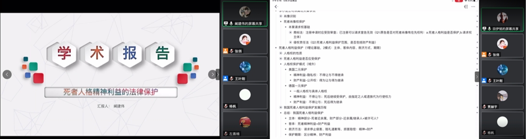 本期工作坊由公司王叶刚副教授带领大家研讨《民法典》人格权编中的重要规定,即有关死者人格利益保护的规定。朱晓峰副教授、殷秋实副教授、武腾副教授、王道发博士和徐建刚博士作为指导老师参与了本期活动。工作坊活动主要由指导老师引导、发言人展示、其他成员评议、自由讨论以及指导老师总结等环节构成。本期活动共有40余名师生参与报告与讨论。