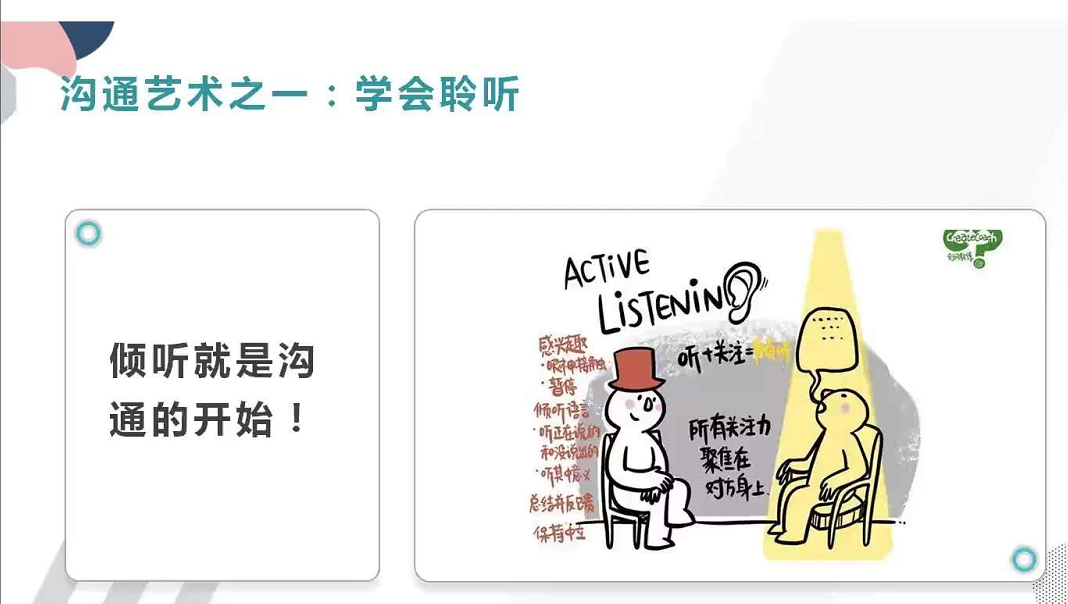 沟通技巧之一是学会聆听。人的本能是表达,是让别人听到我们的声音。但仅靠表达,我们不能说服别人。倾听是沟通的开始,人际关系最大的奥秘在于倾听而不是倾诉。倾听者通过点头、目光在对方身上流转等肢体语言或者记笔记等方式给予积极的回应,可以让对方感知到其在沟通过程中处于主体地位。古罗马童话故事中维里普拉卡庙,通过夫妻双方交替聆听、倾诉的过程化解夫妻矛盾。故而在某些程度上,聆听可以解决矛盾。