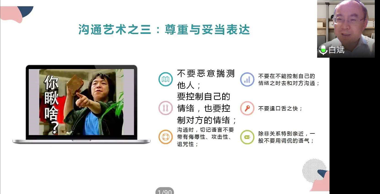 讲座伊始,白斌副教授通过日常生活现象之反思引出沟通的普遍性,促使同学重视沟通效用,总结沟通小技巧并应用于各个方面。