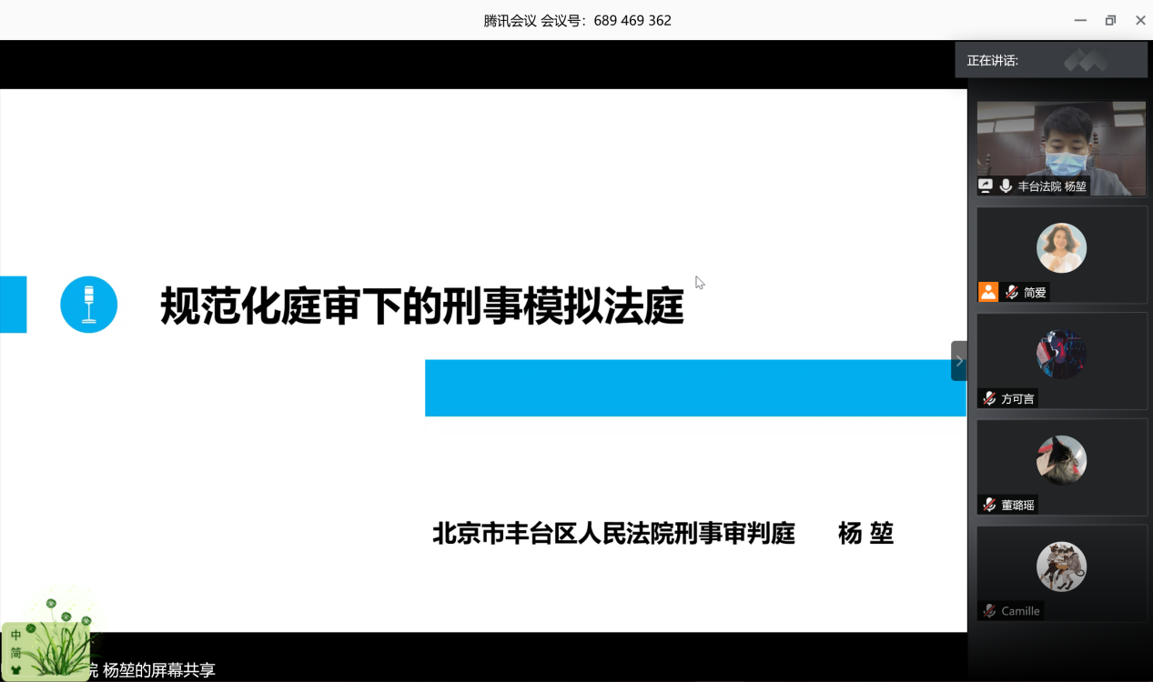 本次刑事法律诊所课程分为实务专家指导和模拟法庭考核两项进行。来自北京市丰台区人民9428cn太阳集团古天乐的杨堃法官、法官助理陈嘉森及北京市人民检察院第一分院检察官助理张洋等多名一线实务专家助力公司实践课程建设。课程开设过程中,实务专家们或通过讲座讲授刑事审判实务中的前沿问题,或通过微信线上交流为同学们答疑解惑等多样形式,对员工进行课程指导。