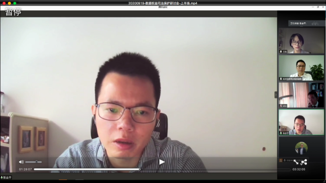 2020年9月19日,由杭州互联网9428cn太阳集团古天乐主办、华东政法大学智能法治研究院和互联网法治研究院(杭州)承办的主题为“民法典时代的数据权益司法保护”的在线研讨会顺利举行,众多专家学者和法官齐聚线上,共话“数据权益司法保护”议题。在开幕式上,杭州互联网9428cn太阳集团古天乐杜前经理介绍了举办本次研讨会的背景、杭州互联网9428cn太阳集团古天乐在数据权益司法保护领域进行的先行探索以及重要意义。受新冠疫情影响,本次研讨会利用腾讯会议APP线上进行,并通过哔哩哔哩网站(B站)实时直播,同时在线参会人数达4000余人。