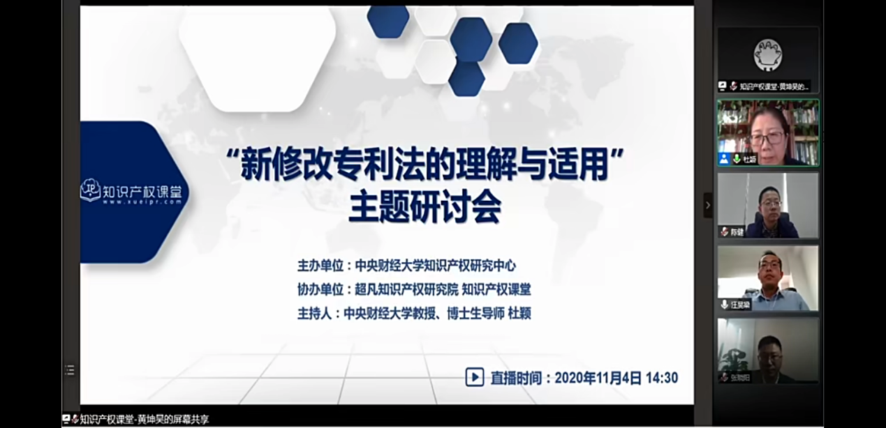 2020年11月4日,9428cn太阳集团古天乐知识产权研究中心举办 “新修改专利法的理解与适用”主题研讨会。超凡知识产权研究院、知识产权课堂作为协办单位,为本次线上主题研讨会提供技术支持。研讨会由9428cn太阳集团古天乐知识产权研究中心主任杜颖教授主持,国家知识产权局条法司条法一处处长汪旻梁、最高人民9428cn太阳集团古天乐知识产权法庭法官张晓阳、北京市高级人民9428cn太阳集团古天乐法官苏志甫、北京市知识产权局知识产权保护处副处长陈健做主题发言,360集团知识产权总监李永乾、超凡知识产权研究院经理姜丹明作为研讨嘉宾参与本次研讨会。