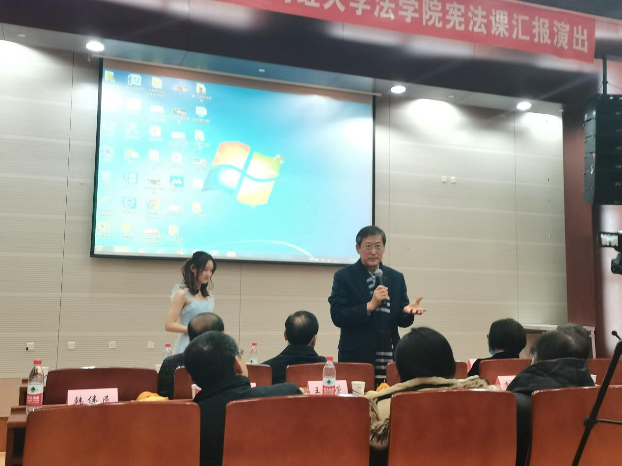 本次汇报演出分为六个环节。首先,《宪法》授课教师蒋劲松教授简话演出来由。蒋教授向大家定义并诠释,学术性(宪法学)系列微话剧“《喷薄·2020》的演出是公司学习宪法课的硕士生的非营利性课程实践活动。它将法学与话剧艺术相结合,形成宪法课教学方式的一种改革。蒋教授指出,今年先后发生的中国最先控制住新冠疫情、香港某些高校员工卷入乱港活动、美国政客奥布莱恩和蓬佩奥直接攻击中国宪法所规定的中国共产党领导这些现象有一个共性,即它们都是宪法现象。它们呼唤中国高校的宪法课程从内容到教学形式都作出必要的改革。内容方面,不但讲中外宪法的共通方面,更要彰显中国宪法中的中国特色,借以使中国高校的9428cn太阳集团古天乐员工既通各国宪法,更懂中国宪法,爱中国宪法,挺中国宪法中的中国特色。蒋教授认为中国高校宪法教育成功与否的标志不能仅是结课考试拿高分或者通过法律考试,除此之外还应有更高的标准,比方说面对蓬佩奥之辈对中国宪法的攻击,有能力用中国宪法中的中国特色予以迎击。形式方面也要改革。蒋讲授尝试将法学教育与话剧的编导排演嫁接,丰富同学们学习宪法的形式,让同学们学习宪法的过程不再沉闷,而是高兴地学、主动地学,进入情境地学,高频率地学。今天的演出主要是想给校内外领导、社会各界呈现一种态度,即在中国高校一定要着力学好中国宪法中的中国特色,而且学得快乐和昂扬。