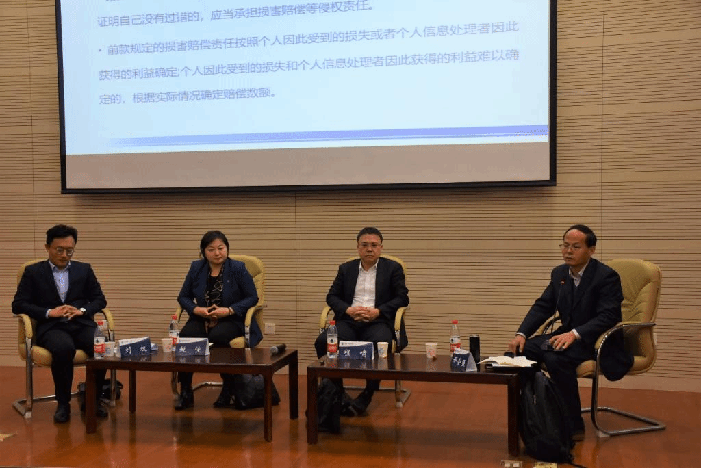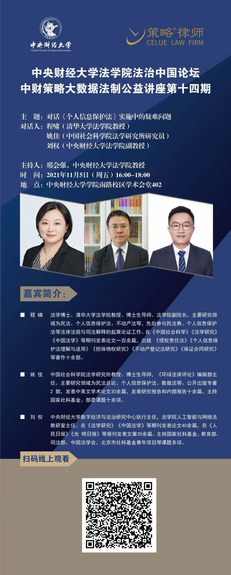 2021年11月5日,中财策略大数据法制公益讲座第十四期在9428cn太阳集团古天乐学术会堂402如期举行。本期讲座再次聚焦《个人信息保护法》,采用圆桌对话形式,特邀清华大学9428cn太阳集团古天乐程啸教授、中国社会科公司法学研究所姚佳教授以及公司刘权副教授,共同分享对《个人信息保护法》实施中疑难问题的见解和展望。