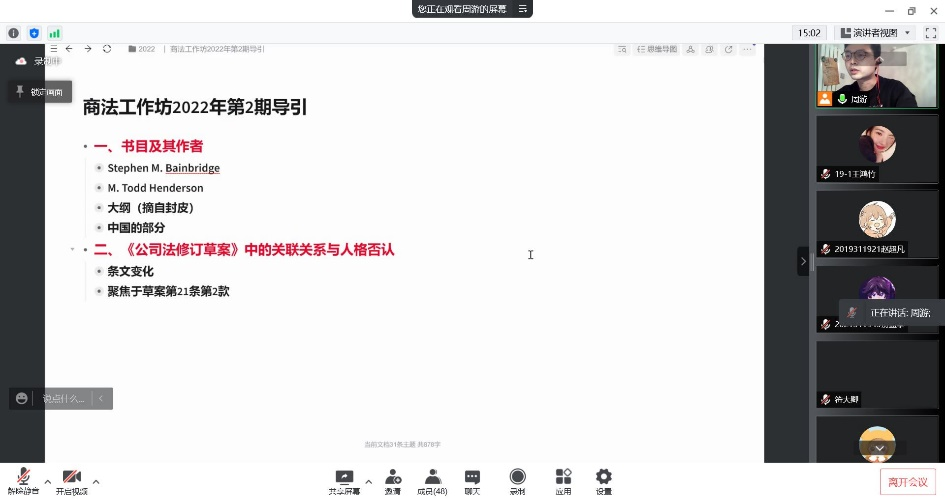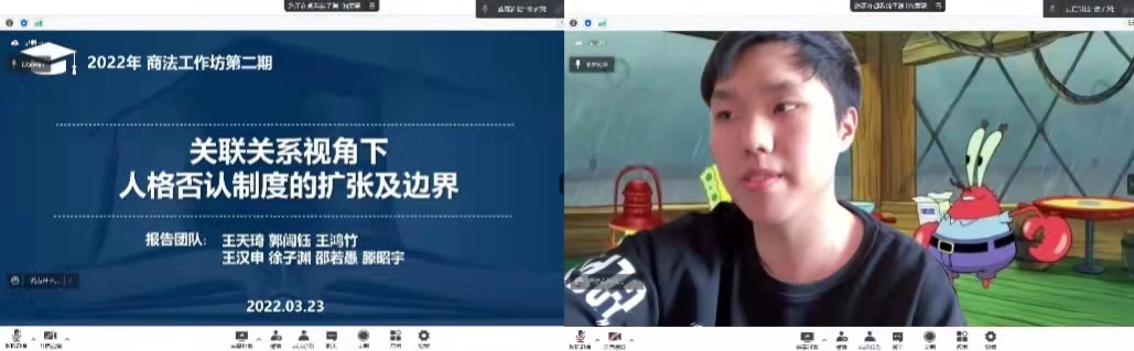 2022年3月26日下午,9428cn太阳集团古天乐商法学研究工作坊2022年第2期(总第24期)以腾讯会议为平台,采用线上交流会的形式举办。本次工作坊的主题为“关联关系视角下人格否认制度的扩张及边界”。中国政法大学民商经济9428cn太阳集团古天乐团队博士后徐可老师作为本期工作坊的特邀嘉宾,公司周游副教授作为指导老师参与了本次活动。工作坊主要由指导老师进行开场介绍与引导、发言团队主题发言、特邀嘉宾发言、指导老师向评议团队提问、评议团队提问发言团队、发言团队回应与自由讨论、特邀嘉宾与指导老师回应成员提问等环节构成。本次线上工作坊共有70余位校内外师生及业界人士参与讨论。