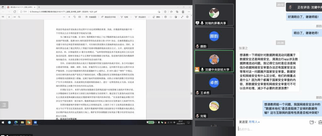 在自由提问与讨论环节,沈健老师首先对两个同学提出两个问题:第一,中国海事仲裁委发布的临时仲裁规则为《中国海商法协会临时仲裁规则》,汇报人是否注意到这与其他仲裁委员会的临时仲裁规则命名上的区别;第二,刘瑞同学文章中的立法管辖权与立法有何区别,滴滴事件中数据立法管辖权问题如何体现。参加工作坊的同学提出了两个问题:数据安全与网络安全如何区分;数据本地化是否是阻挠了全球的数据传输。随后,王卓然和刘瑞同学分别对上述问题进行逐一回应。