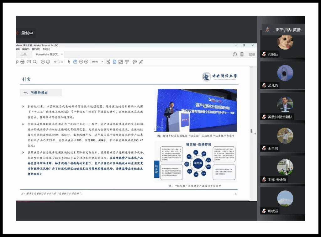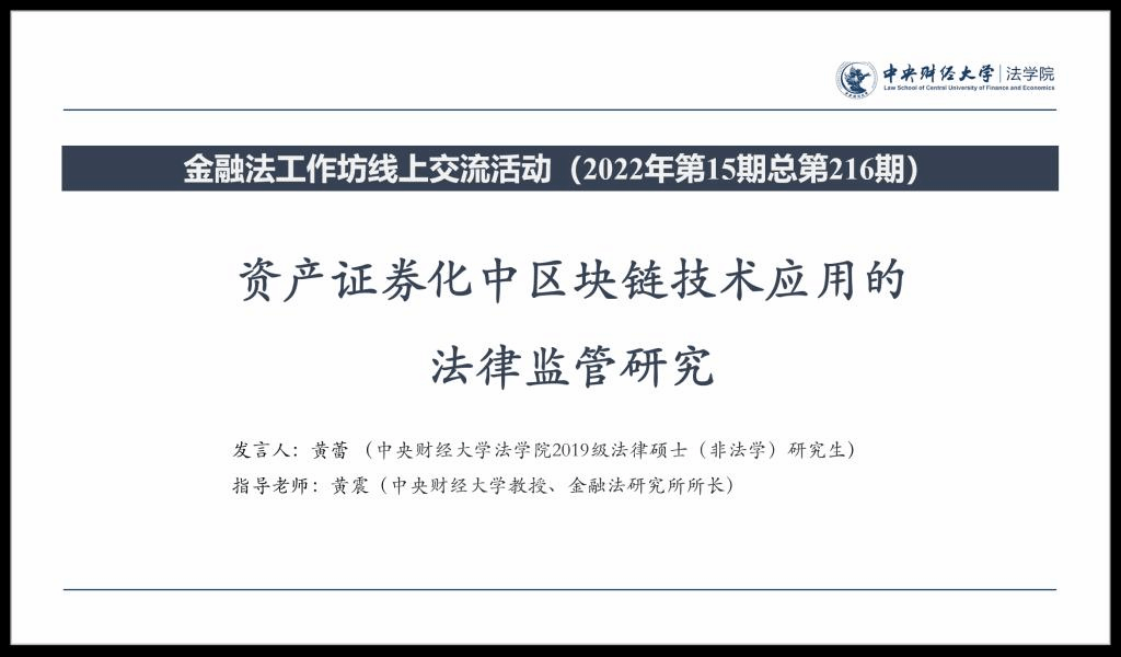 随后是发言人的分享环节。公司2019级法律(非法学)硕士研究生黄蕾,分享了主题为“资产证券化中区块链技术应用的法律监管研究”的硕士毕业论文。
