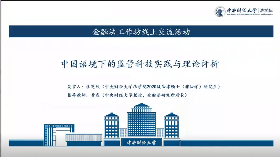 随后是发言人的分享环节。公司2020级法律(非法学)硕士研究生李芝欣,分享了主题为“中国语境下的监管科技实践及理论评析”的小论文。