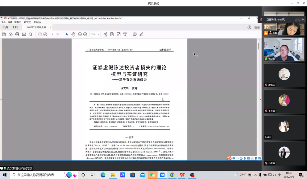针对第四个问题“描述性统计分析实例”,徐文鸣老师以自己公开发表的论文《证券虚假陈述投资者损失的理论模型与实证研究——基于有效市场假说》来例证和演示实证方法在法学研究领域中的具体运用。研究围绕着司法审判和理论研究的热点与难点“如何估算证券市场虚假陈述行为给投资者造成的损失”这一问题展开。实例分享的内容涉及从如何收集梳理裁判文书,到类案实证分析,再到理论溯源,以及运用金融学理论解决理论与实践层面的争议问题。徐老师深入浅出地为同学们讲解了法学实证研究的方法的运用。
