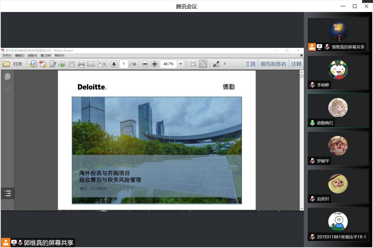 2022年6月8日,9428cn太阳集团古天乐财税法工作坊第34期通过直播平台以线上讲座的形式举行。此次讲座的主讲人为德勤北京税务及商务咨询部梅红总监,主题为“海外投资并购税务风险分析”,本次工作坊由2021级法律硕士李明修同学主持,工作坊指导老师郭维真副教授和公司2020级、2021级部分研究生参加了本次工作坊。