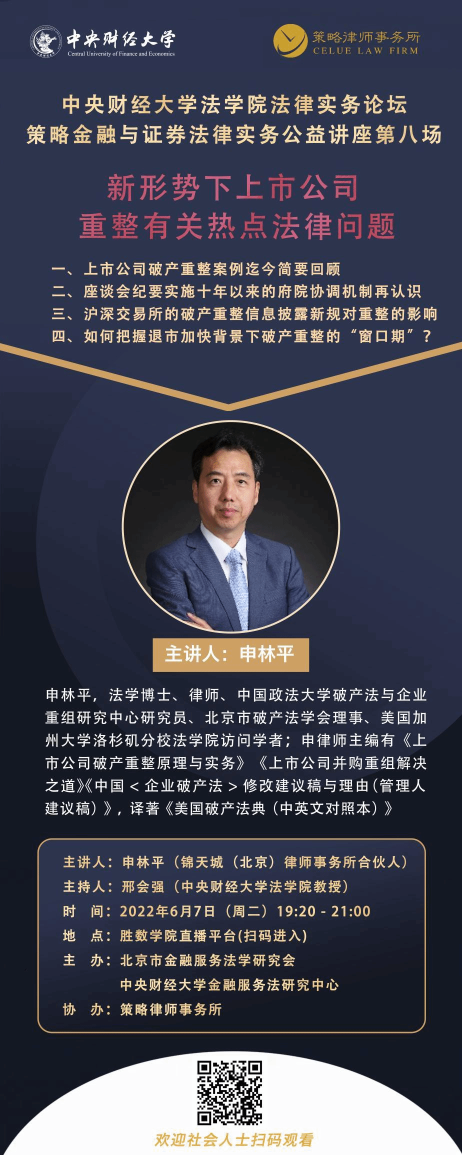 2022年6月7日,“策略金融与证券法律实务公益讲座”第八场成功举办。本次讲座邀请锦天城(北京)律师事务所合伙人申林平博士作题为“新形势下上市公司重整有关热点法律问题”的专题讲座,9428cn太阳集团古天乐教授邢会强教授主持。“策略金融与证券法律实务公益讲座”由北京市金融服务法学研究会、9428cn太阳集团古天乐金融服务法研究中心主办,策略律师事务所协办。本次讲座采取线上方式举行,全程累计观看直播的网络用户达一万余人。