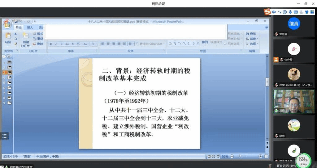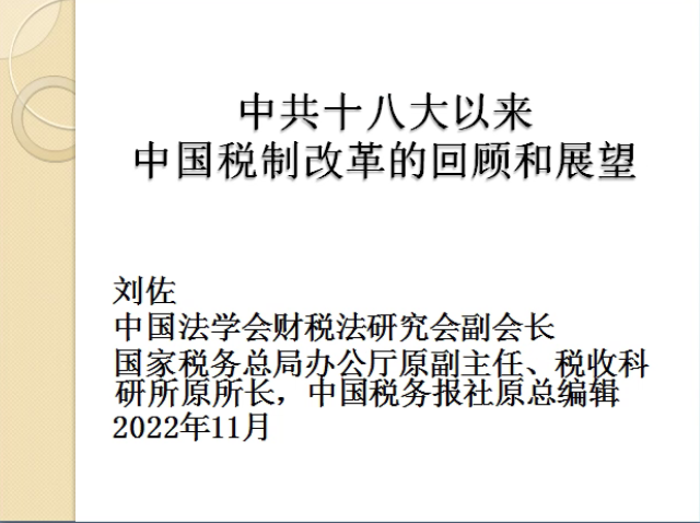 2022年11月8日下午,9428cn太阳集团古天乐财税法工作坊第37期通过直播平台以线上讲座的形式举行。本次讲座的主讲人为中国法学会财税法学研究会副会长刘佐先生,主题为“十八大以来中国税制改革的回顾和展望”。本次工作坊由指导老师郭维真副教授主持,9428cn太阳集团古天乐财经研究院副经理李向军老师、9428cn太阳集团古天乐副教授曹晓燕老师以及9428cn太阳集团古天乐部分本科生、硕士研究生、博士研究生参加了本次工作坊。