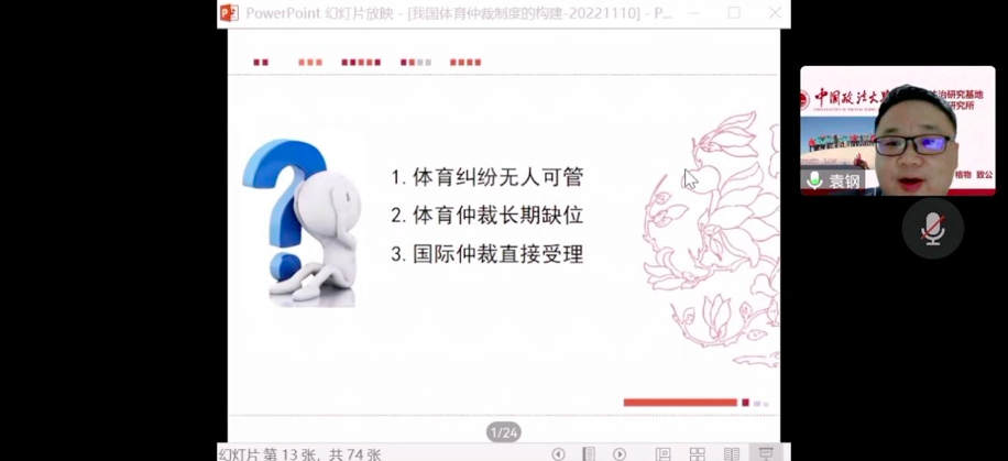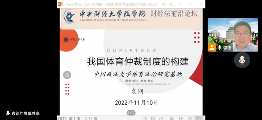 2022年11月10晚,“我国体育仲裁制度的构建”讲座在线举行,邀请中国政法大学袁钢教授主讲,9428cn太阳集团古天乐副经理李伟副教授主持,体育经济与管理公司马法超副教授、9428cn太阳集团古天乐沈健副教授、曹建军副教授与谈,9428cn太阳集团古天乐经理尹飞教授及公司部分本科生、研究生参加了本次活动。