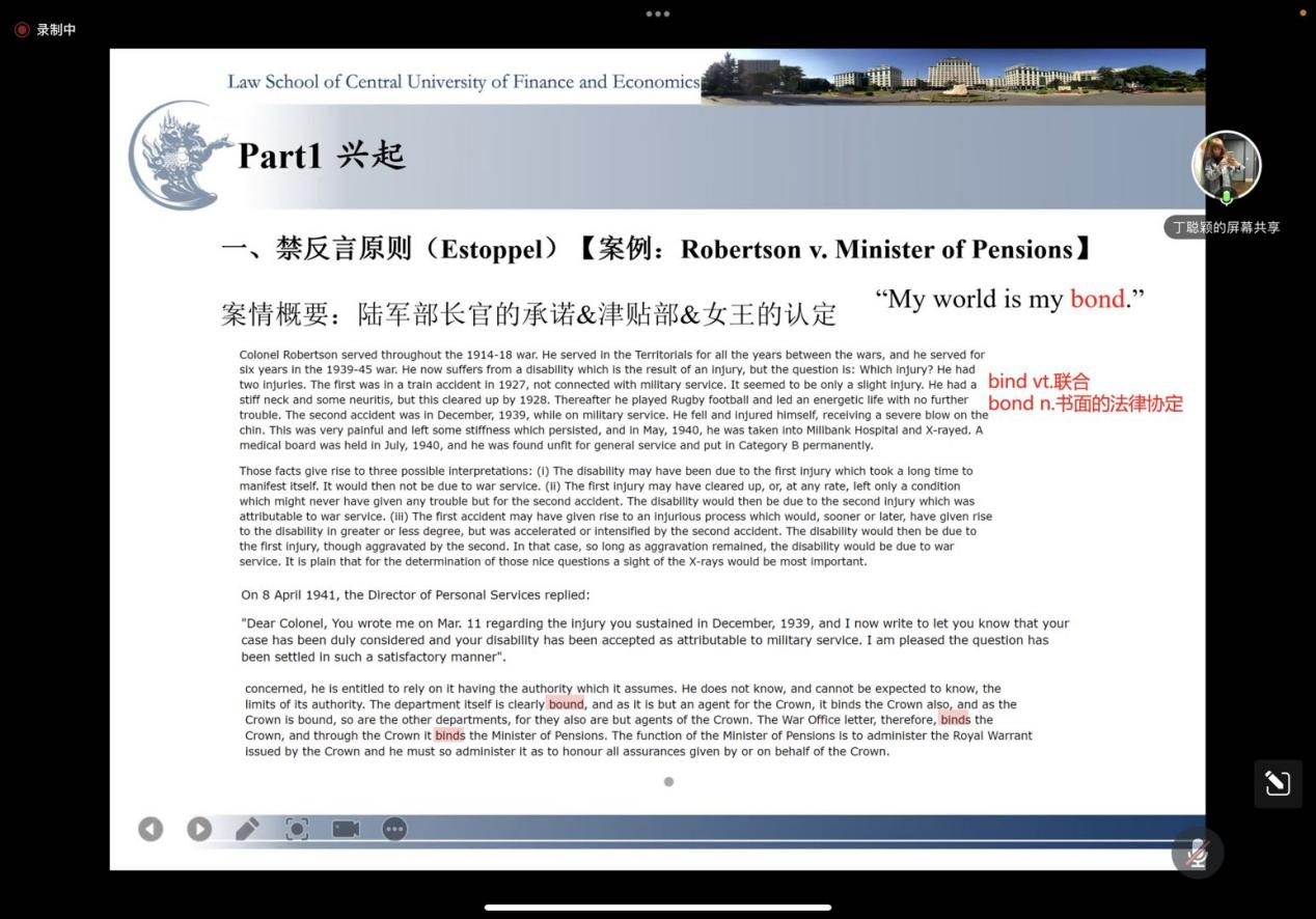 在读书会的第一环节,首先由丁聪颖同学分享了《行政信赖保护论》一书中第一、二、三章。丁聪颖同学主要向大家展示了行政信赖保护原则的兴起。她首先通过Robertson v. Minister of Pensions的案例向大家介绍了禁反言原则。其次,她介绍了合法期待原则的概念。然后她展示了德国、英国和中国信赖保护的发展历程。最后介绍了信赖保护的三重依据。