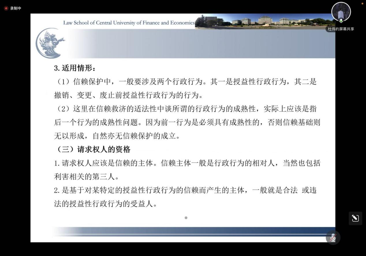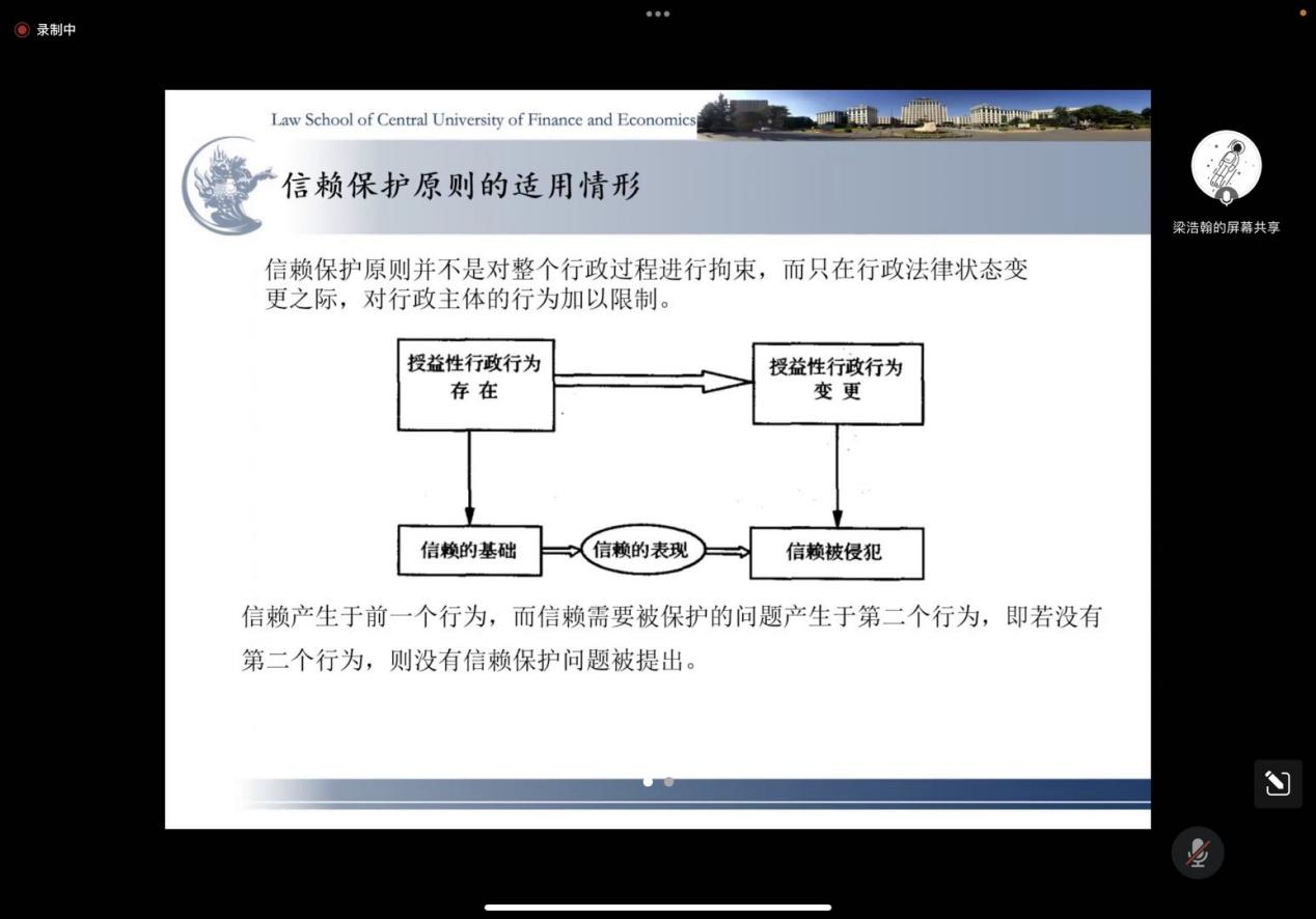 2022年11月26日晚,中财公法学工作坊第30期读书会于线上成功召开。本期公法学工作坊以“公法的原则”为主线,围绕“信赖保护原则”开展研讨。读书会以线上会议形式进行,由公司2021级本科生杜伟、2021级本科生梁浩瀚、2022级硕士研究生丁聪颖作为报告人,2022级硕士研究生李世伟担任主持人。公司张小平副教授、刘权副教授、刘馨宇讲师三位老师作为本次工作坊的指导教师参与了读书会,与来自公司的二十名本科生、硕士生共同探讨“信赖保护原则”中的若干问题。