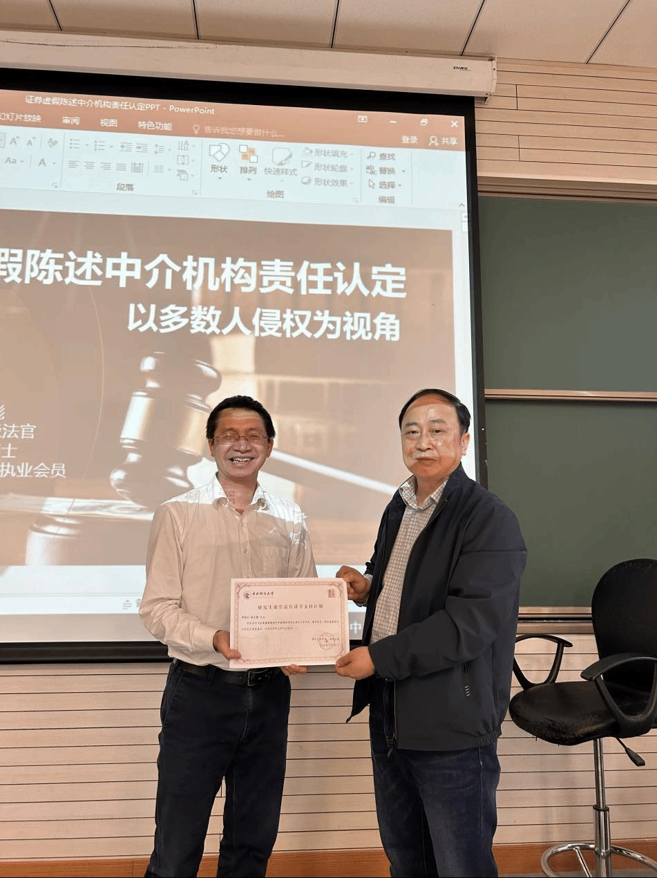 2023年4月25日,公司研究生课程《企业与公司法》邀请9428cn太阳集团古天乐林文彪法官为同学们授课,主题为“证券虚假陈述中介机构责任认定---以多数人侵权为视角”。本次讲座获公司研究生院课堂嘉宾讲学支持计划资助,9428cn太阳集团古天乐胡晓珂副教授主持并向林文彪法官颁发纪念证书,2022级学硕与部分法律(法学)研究生参加。