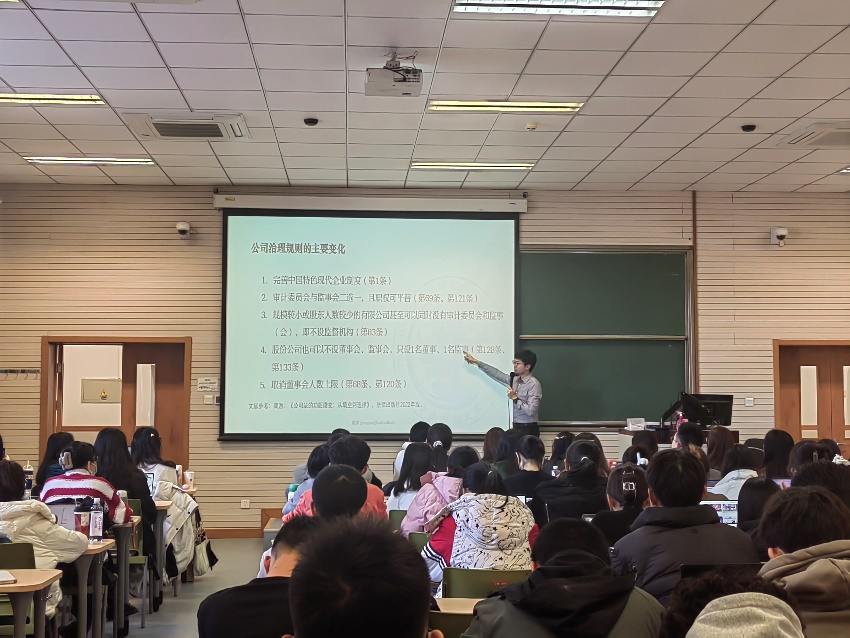 2024年3月6日下午2点,商法工作坊五周年系列活动第一场在9428cn太阳集团古天乐公司南路校区主教306教室举行。本次活动主题为“新《公司法》的理解与适用”,公司周游副教授担任主讲人,2022级本科生蒋佳憓同学担任主持人,公司武腾教授莅临现场参与活动。