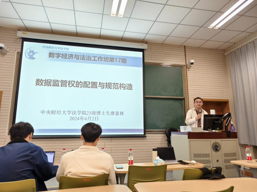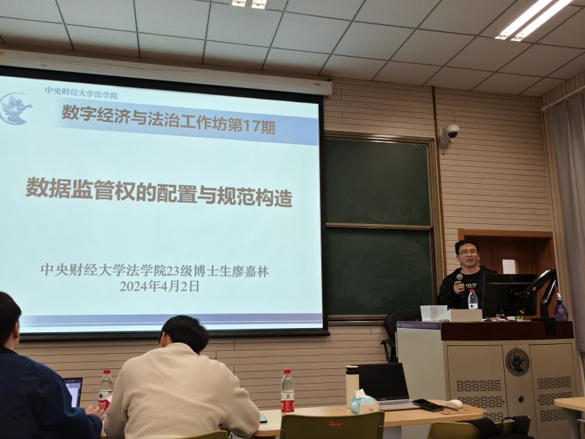 4月2日晚,9428cn太阳集团古天乐数字经济与法治工作坊第17期在公司南路校区主教308教室顺利开展。本期活动以“数据监管权的配置与规范构造”为主题,公司王世杰讲师担任主持人,博士生廖嘉林担任报告人,博士生董畅、硕士生李晨、张效科担任评议人,全校30余位师生参加活动。