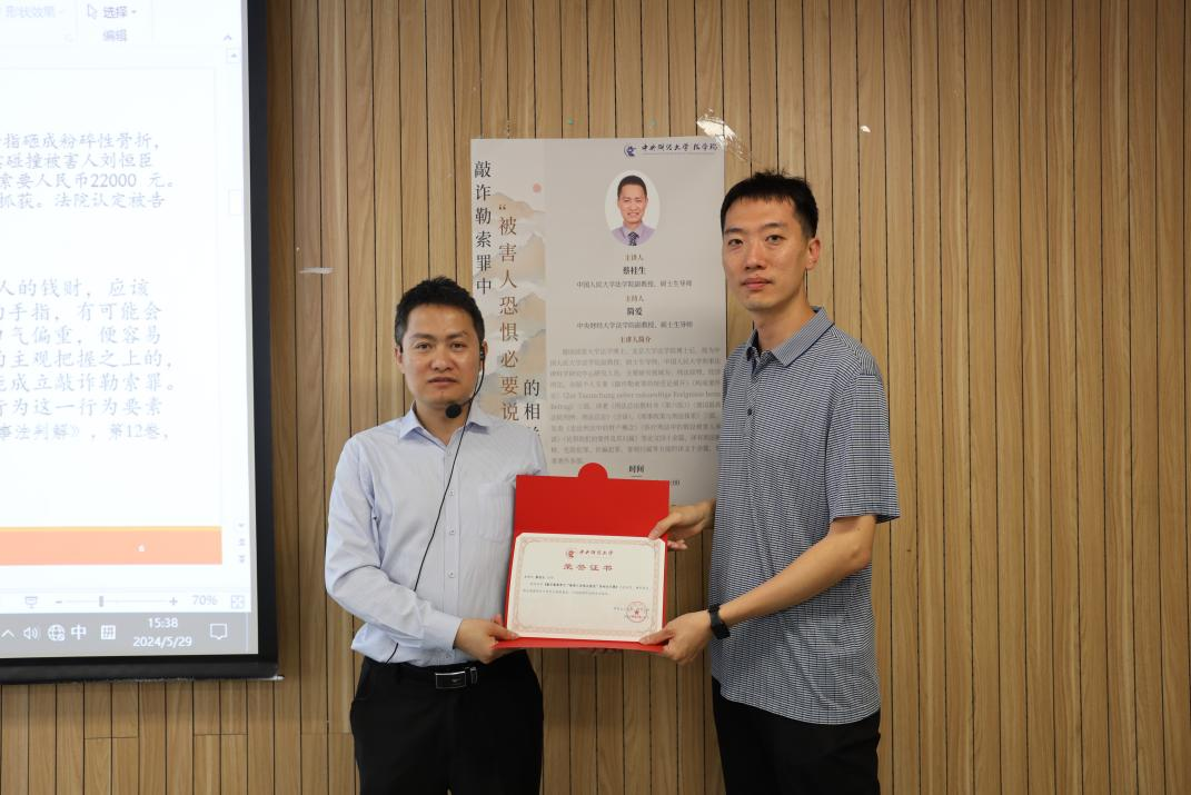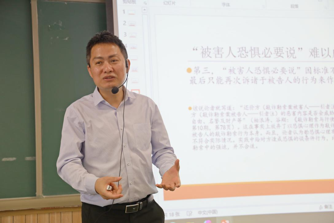 5月29日下午,在公司研究生课堂嘉宾讲学计划的支持下,中国人民大学9428cn太阳集团古天乐副教授、中国人民大学刑事法律科学研究中心研究人员蔡桂生应邀为公司公司研究生作“敲诈勒索罪中‘被害人恐惧必要说’的相关问题”主题讲座,讲座由简爱副教授主持。