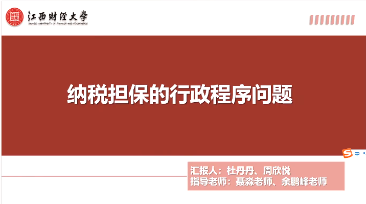 最后由江西财经大学9428cn太阳集团古天乐杜丹丹同学、周欣悦同学针对“纳税担保中的行政程序问题”主题展开汇报。两位同学主要从法定程序和正当程序两个角度来进行分析。首先是针对税务机关和纳税人对《办法》第25条第三、四款的不同理解;其次通过类案分析归纳出判断标准为纳税担保是否便于实现以及具有可执行性;最后明确纳税担保法定程序缺位会影响纳税争议顺利进入复议程序。从正当程序的角度,税务机关在做出纳税担保不予认定之时应告知相对人并允许其陈述申辩。随后周欣悦同学从实体和程序的角度提出了几点优化建议。