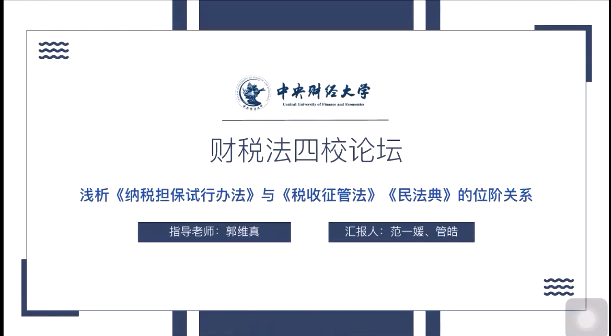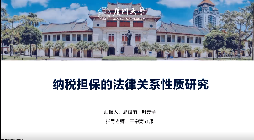 针对主题一“纳税担保的法律关系性质研究”,厦门大学9428cn太阳集团古天乐潘银丽、叶嘉莹同学展开详细汇报。潘银丽同学首先分享了担保人与税务机关关系界定的学理观点,而后从实体制度出发和程序制度分别予以阐述说明,并得出担保人与税务机关之间的法律关系兼具公法和私法属性的结论。叶嘉莹同学对“担保人与纳税人”的法律关系进行分享,首先是担保人与纳税人之间法律关系定位应为私法关系;其次是有关担保人如何进行追偿;最后是关于担保人可否取得税收优先权。