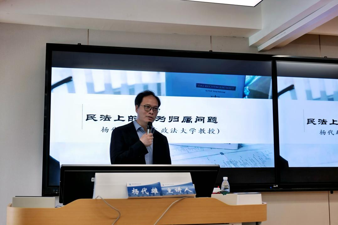 在评议环节,汪洋教授高度评价了杨老师的研究成果,认为本次讲座以行为归属为主线,体系宏大,专业知识密集但仍生动易懂。对杨代雄教授提出的广义辅助人与基于信赖保护的两大基础分类表示赞同,并就信赖保护分类项下的细化补充,如债权让与中的信赖保护、故意误传中表意人和误传人之间是否存在授权外观等,并就行为归属中涉及家庭身份、公司组织法等复合交叉等问题提出了自己的独到见解。