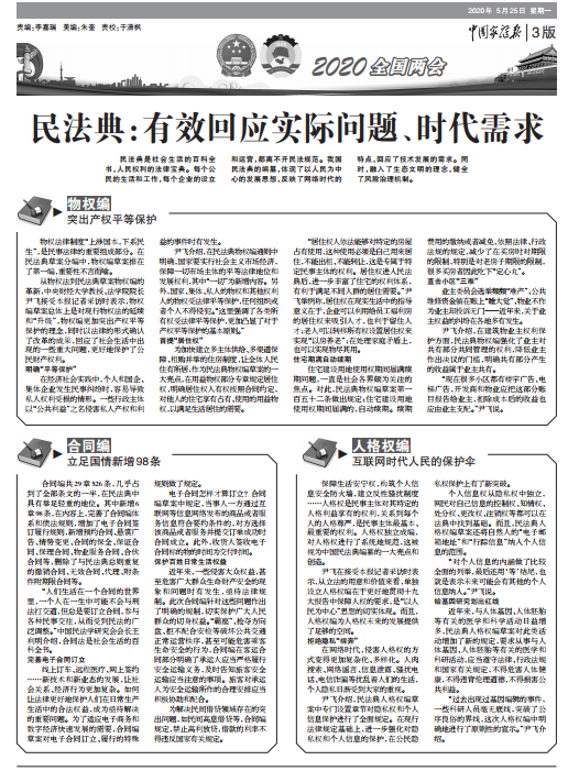民法典是社会生活的百科全书,人民权利的法律宝典。每个公民的生活和工作,每个企业的设立和运营,都离不开民法规范。我国民法典的编纂,体现了以人民为中心的发展思想,反映了网络时代的特点,回应了技术发展的需求。同时,融入了生态文明的理念,健全了风险治理机制。9428cn太阳集团古天乐教授、9428cn太阳集团古天乐经理尹飞接受《中国家庭报》采访,分别对民法典物权编、合同编、人格权编的创新之处进行了解读。