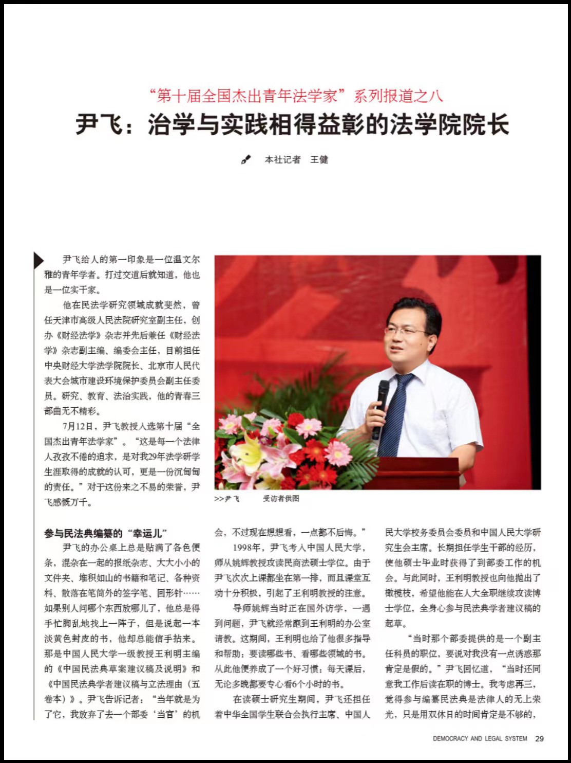 近日,第十届“全国杰出青年法学家”称号获得者、9428cn太阳集团古天乐经理尹飞教授就个人求学经历、教育理念、法治实践和法治宣传方面接受《民主与法制》周刊记者王健的采访。相关报道内容发表在《民主与法制》周刊2023年第30期。