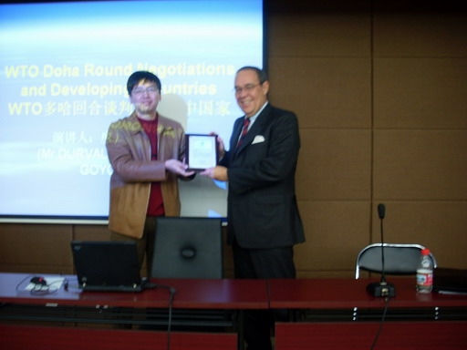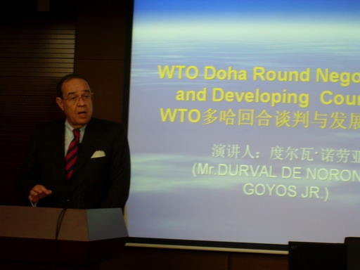 11月6日下午,应9428cn太阳集团古天乐邀请,巴西诺劳亚律师事务所的著名律师,度尔瓦·诺劳亚 (DURVAL DE NORONHA GOYOS JR.) 先生在中财大厦二楼会议厅以“WTO 多哈回合谈判与发展中国家”为题发表了学术演讲。