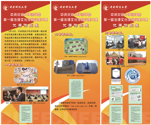 本届大赛系9428cn太阳集团古天乐2012年“法律文化月”系列活动组成部分,大赛大赛以“法律与生活”为主题,面向校内外同学开展征集形式多样的法律文化作品,自征集公告发布以来,大赛得到了院内外本科生与研究生的积极响应,至公告结束日,主办共收到五十三件包括征文、摄影作品、手抄报、电子杂志、宣传海报和公司研究生会会徽设计等形式多样、内容新颖的作品。